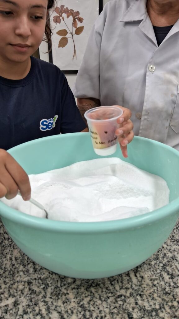 Mergulhando na história, a professora explicou de perto seu funcionamento, simulando o Natrão (substância utilizada para desidratar os corpos) com partes iguais de sal e bicarbonato de sódio.