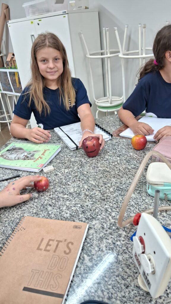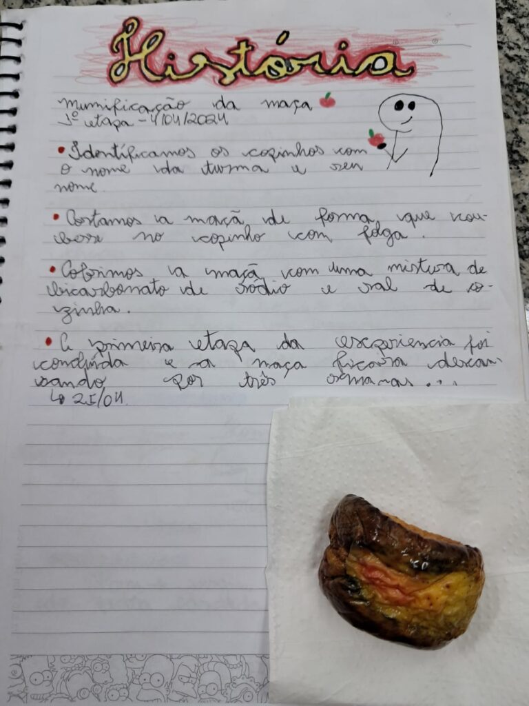 Assim, os alunos, munidos de maçãs, copos descartáveis e muita vontade de aprender, iniciaram o processo de mumificação das maçãs e, ao longo de três semanas, acompanharam, através do relato da experiência em seus cadernos, todas as nuances que envolvem o experimento.
