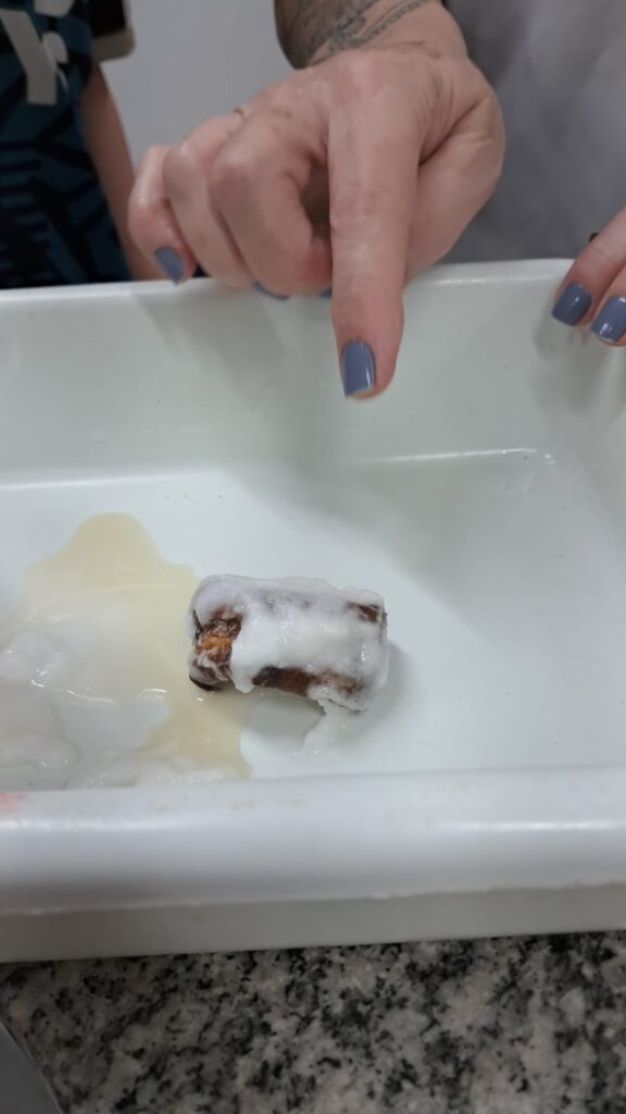2ª etapa: após três semanas, os alunos voltaram ao laboratório para acompanhar o tão esperado resultado final. O que era antes uma bela maçã bem vermelha e crocante, perdeu toda sua umidade e tornou-se pequena, mole e escurecida. Já a mistura que era em pó, ficou parecida com uma pasta, pois a água da fruta foi transferida quase por completo para a mistura (assim como acontecia com os corpos mumificados).